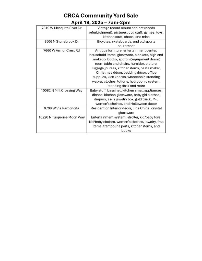 CRCA Community Wide Yard Sale April 19th, 2025 From 7am to 2:00pm